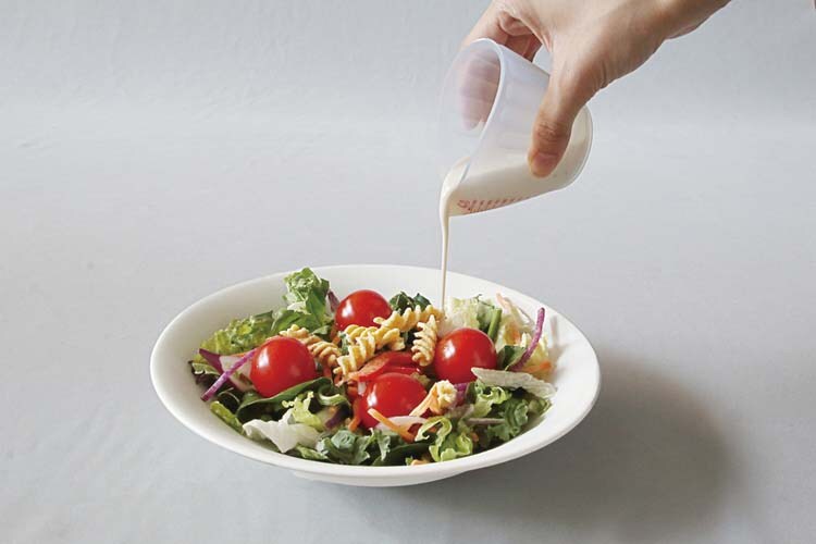 ●サイドを押すと先がすぼまり、注ぐ作業が簡単にできるメジャーカップ。