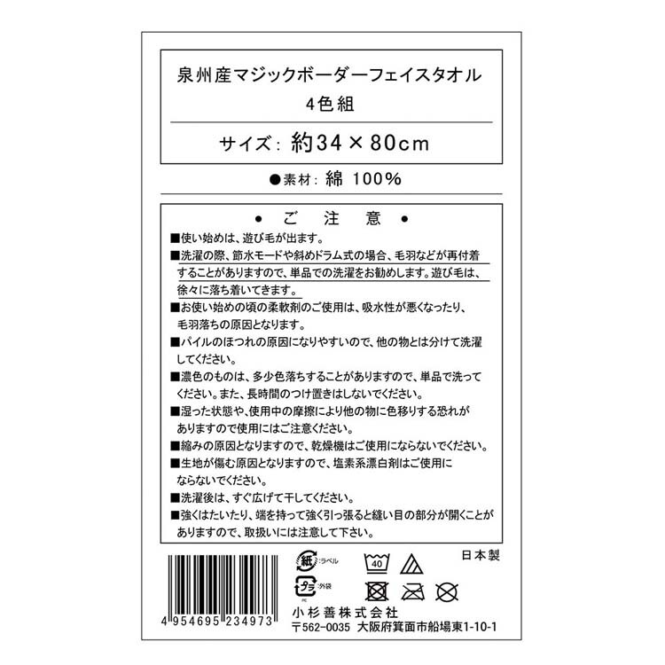 小杉善 泉州産 マジックボーダー フェイスタオル 4色 (4枚入)