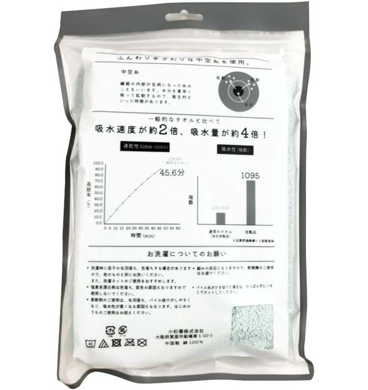 ●ふんわり手ざわりな中空糸を使用しています。中空糸とは繊維の内部が空洞になった糸のことをいいます。水分を素早く吸って拡散するので、衛生的といった特徴があります。