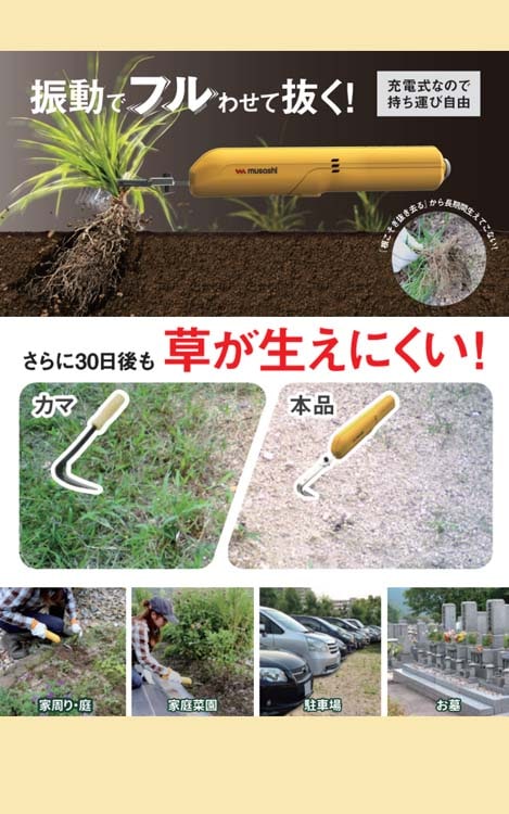 ●ふるわせて根こそぎ雑草を抜く除草バイブレーター。