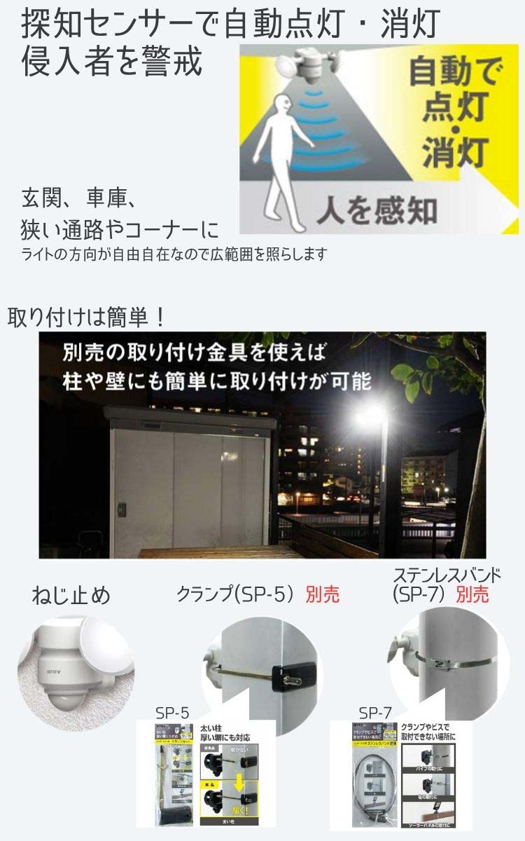 | サイズ:幅188*奥行80*高さ107mm 重量:約380g 電源:AC100V電源 コード長さ:1.5m 消費電力:点灯時 約11W(待機時:1.0W以下) 電球種類:LED 全光束:900ルーメン LED設計寿命:40000時間 探知角度:水平約140度 探知距離(最大):約6m 点灯時間:約30秒(固定) 点灯機能:周囲が暗い時のみ点灯 設置場所:屋内、屋外用(防雨タイプ IP44) 取付方法:ネジ取付、クランプ取付(別売)、ステンレスバンド取付(別売) |