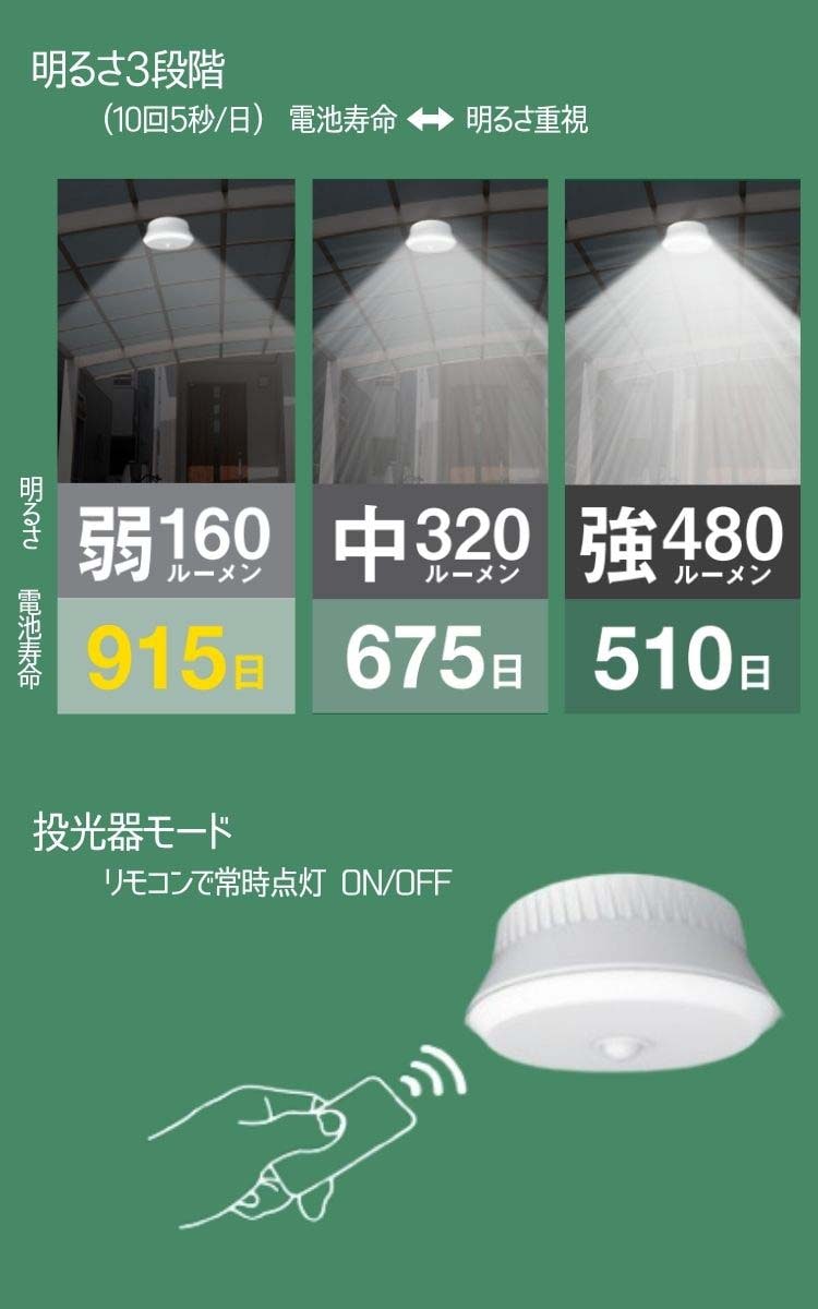 | 明るさ:480/320/160ルーメン 昼白色 投光器機能:あり 明るさ調整:あり 強・中・弱 点灯時間:5/10/20/30秒 センサー反応照度:4段階 電池寿命:約915日 ※1日10回5秒・弱点灯時 連続点灯:最長8.5時間 使用電池:単一電池*3本 |