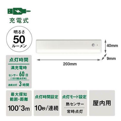 | サイズ:W203×D9×H40(mm) 重量:約75g 電源;Li-ion 3.7V/500mAh 明るさ:50ルーメン モード切替:熱センサー(10 秒点灯)/ 切/ 常時点灯 電池寿命:熱センサー(60 日(1 日10 回点灯))、常時点灯(連続3 時間) 充電:ポート(USB-C)、時間(2 時間(0.5A/5V)) 探知方式:焦電型赤外線センサー 探知範囲:100度/3m 取付方法:マグネット |