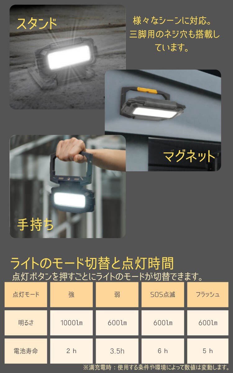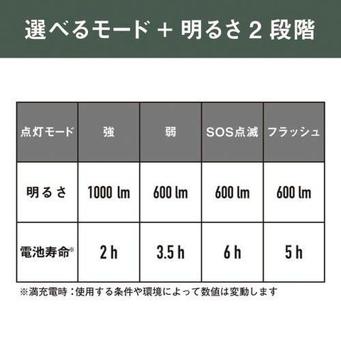 | サイズ:W142×D30×H92(mm) 重量:約245g 充電池:リチウムイオン充電池3.7V 3000mAh 明るさ:メインライト(1000ルーメン/600ルーメン)、SOS点滅(600ルーメン)、フラッシュ(600ルーメン) 点灯時間:3時間/5.5時間 充電時間:5時間 防雨基準:IPX4 備考:背面スタンド・マグネット、給電可能 |