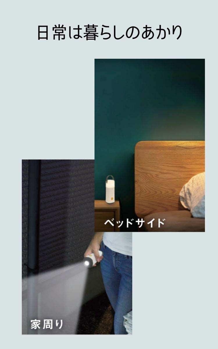 ●普段から使える充電式のミニランタンプラス懐中電灯。日常時は暮らしの明かりとして、テーブルやベッドサイドに。非常時は守る明かりとして、懐中電灯や停電対策としてのランタンに。
