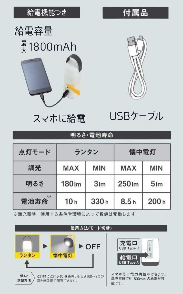 | サイズ:W46×D49 ×H124(mm) 重量:135g 電球:ランタン(2W 全光束180~3ルーメン(電球色))、懐中電灯(3W 全光束250~5ルーメン(白色)※光輝度LED 設計寿命約4万時間) 内蔵充電池:リチウムイオン電池 3.6V/3200mAh 充電寿命:充放電サイクル 1000回 充電時間:3時間(ライト消灯・定格2A以上/5V 充電器を使用した場合) 給電:USB端子 Type-A/USB 出力2A(最大)5V 充電:USB端子 Type-C 設置場所:室内/室外(保護等級 IP44) |