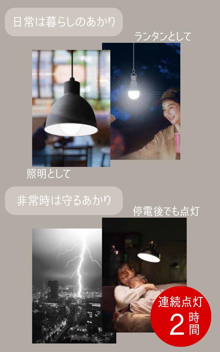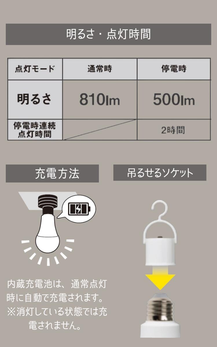 | サイズ:Φ70×135mm 重量:110g 光色:電球色 消費電力:9W 通常時の明るさ:810lm 停電時の明るさ:500lm 停電時の点灯時間:約2時間 バッテリー内容:2000mAh LED寿命:約50000時間 口金:E26 定格電圧/周波数:AC100V/50、60Hz |