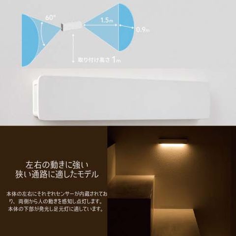 ・本体の左右にそれぞれセンサーが内蔵されており、両側から人の動きを感知し点灯します。本体の下部が発光し足元灯に適しています。