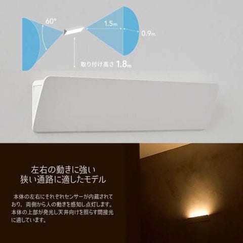 ・本体の左右にそれぞれセンサーが内蔵されており、両側から人の動きを感知し点灯します。本体の下部が発光し足元灯に適しています。