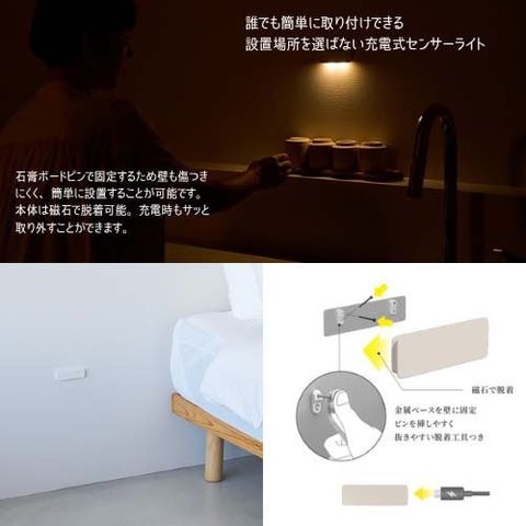 ・石膏ボードピンで固定するため壁も傷つきにくく、簡単に設置することが可能です。本体は磁石で脱着可能。充電時もサッと取り外すことができます。