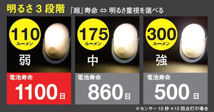 ●電池寿命最大1100日(110ルーメン使用時)※1日センサー10秒*10回点灯の場合