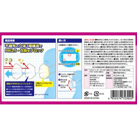 | サイズ:横145*高さ95mm 対象:風邪・花粉・PM2.5 本体外側・フィルタ部:ポリプロピレン 本体内側:ポリプロピレン 耳ひも部:ポリウレタン バー:鉄・ポリエチレン |