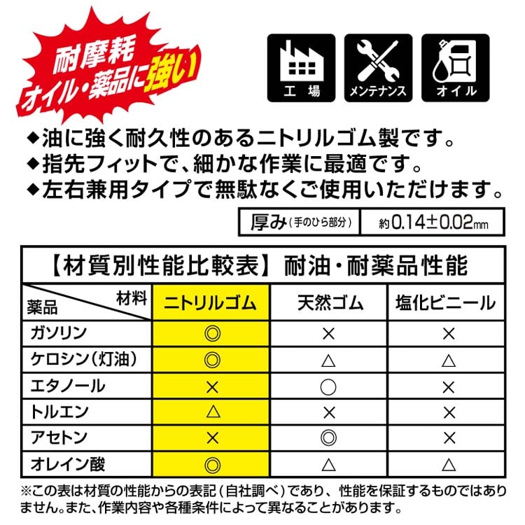 | 個装重量:約370g 内容量:50枚入 ★サイズ Lサイズ ・全長:約24cm ・中指の長さ:約8.8cm ・手の平まわり:約21cm ・厚み(手のひら部分):約0.14±0.02mm ★用途 機械整備業、工場作業、建設業、塗装作業、各種メンテナンス作業 ★材料 ・ニトリルゴム |