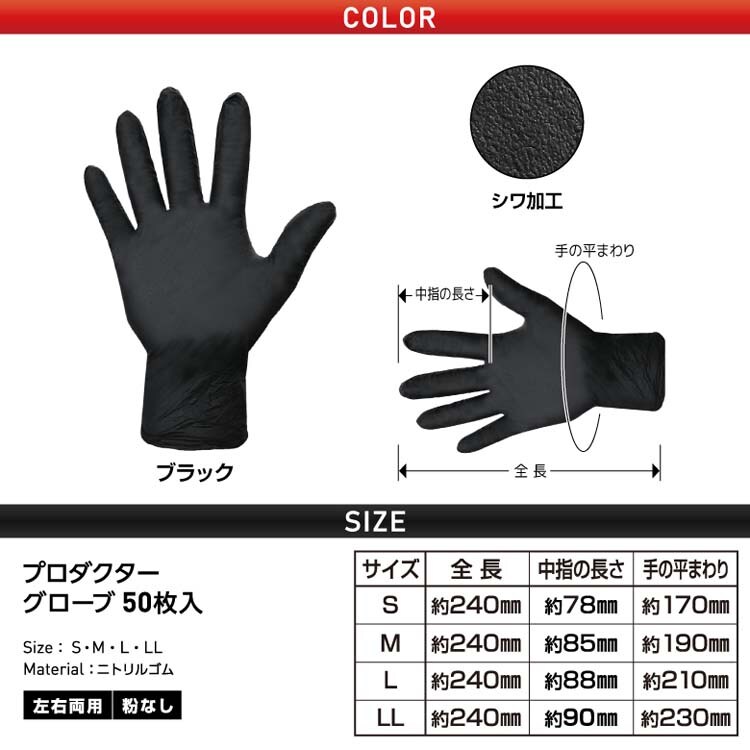 プロダクター グローブ ニトリル薄手袋 粉なし 左右両用 ブラック LLサイズ (50枚入)