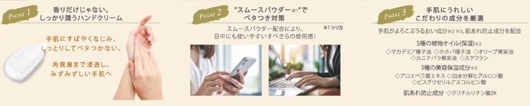 ●手肌にすばやくなじみ、しっとりしてベタつかない。