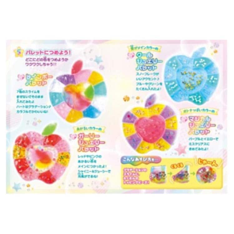 | リンゴ型スライムパレット、スライム7色、トッピングビーズ7種、ドリンクカップ1個、ガイドブック1冊 素材 : パレット/PP、スライム/PVA・グリセリン・顔料、ビーズ/PVC・PS・PET、カップ/本体PS・フタPP、箱/紙、袋/OPP |