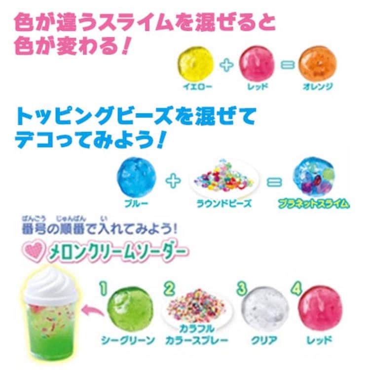 ●7色のカラフルなスライム、7種のトッピングビーズやりんご型のパレット、さらにはドリンクカップまで入っていて、たっぷりあそべるセットです。