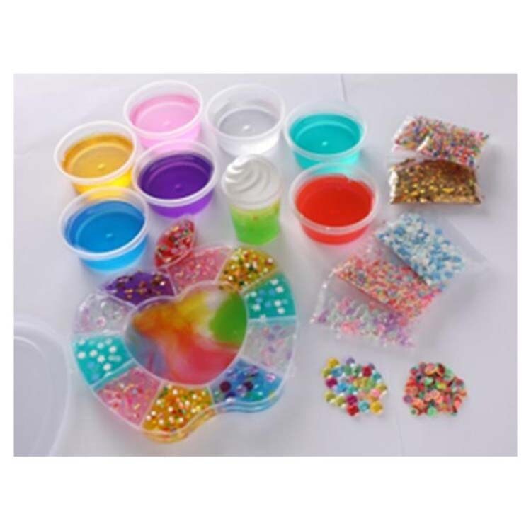 ●混ぜて新しい色を作ったり、グラデーションにしたりと楽しみ方はいろいろ。7種類のユニークなトッピングビーズを混ぜれば、個性的なスライムになります。