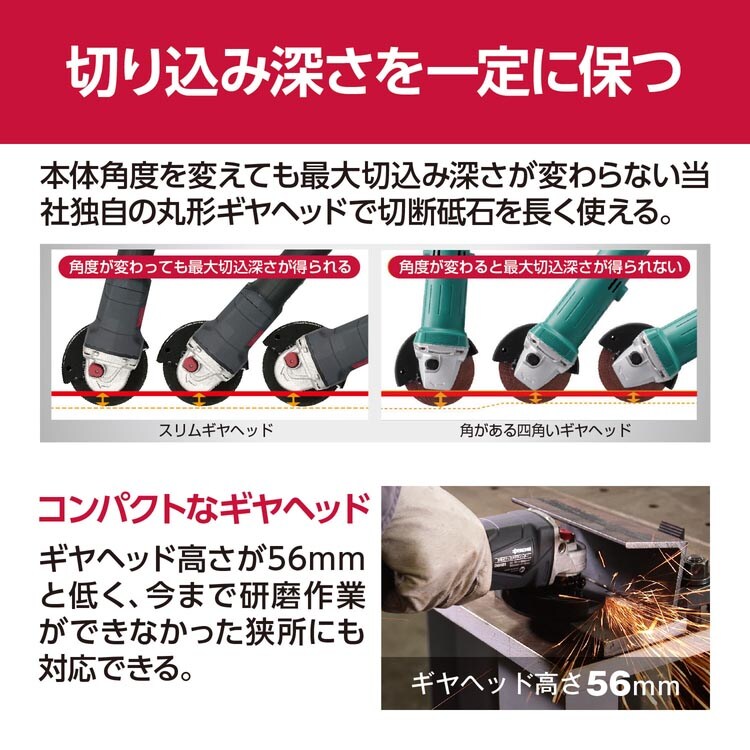 ●本体角度を変えても最大切込深さが変わらない円型ギヤヘッドで切断砥石を長く使えます。