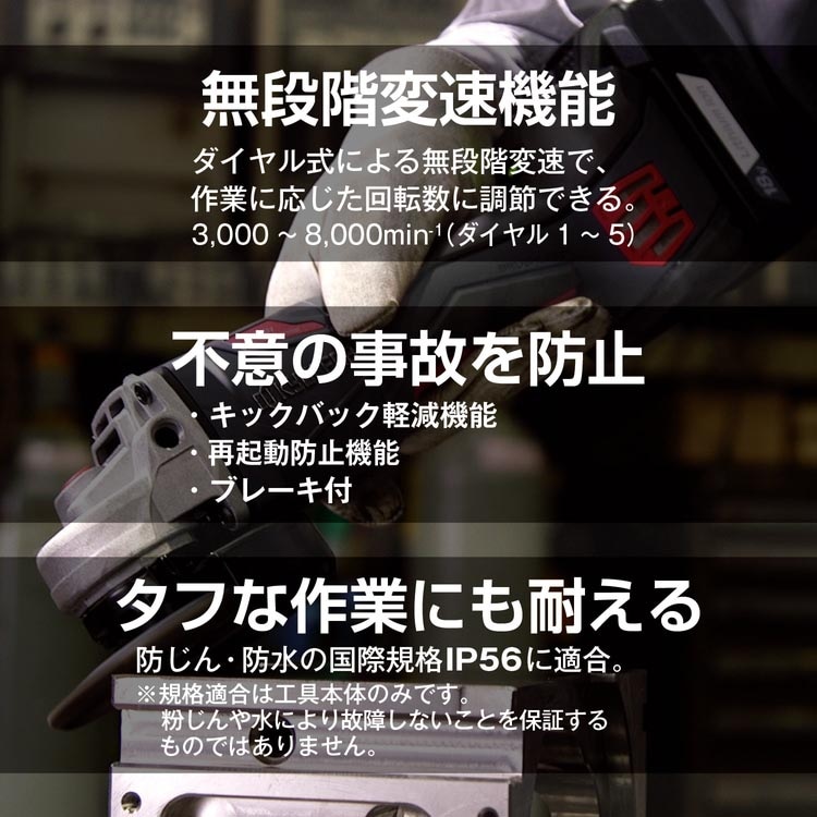 ●防塵・防水に対する国際規格であるIP56に適合しており過酷な環境での使用にも耐える耐性があります(規格適合は工具本体のみです電池パックの防塵・防水を保証するものではありません)。