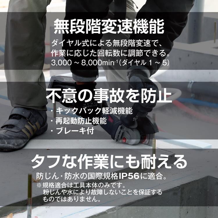 ●タフな作業にも耐えられる防じん・防水の国際規格IP56に適合しています(規格適合は工具本体のみです、粉じんや水により故障しないことを保証するものではありません)。