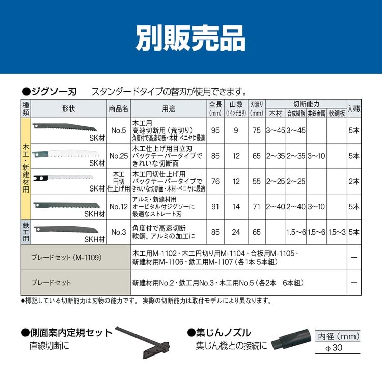・付属品:ジグソーブレード(No.5/木工用)×1・六角棒レンチ(3mm/本体収納)×1。