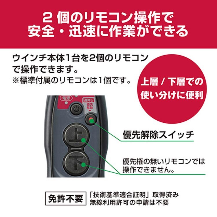 ●荷揚げ操作をコードレスで遠隔操作(約30m)できるリモコンタイプです。