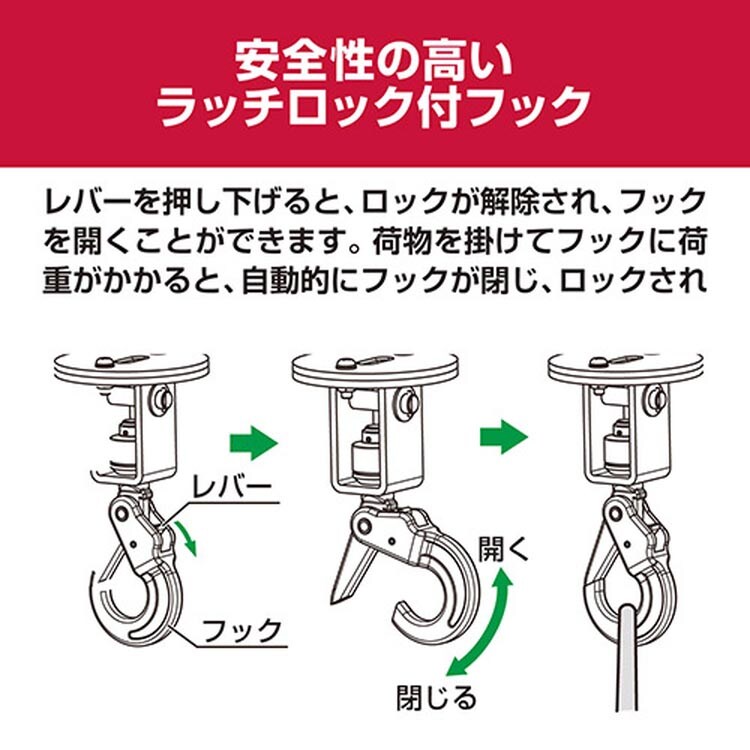 ●ラッチロックフックで安全性が向上しています。