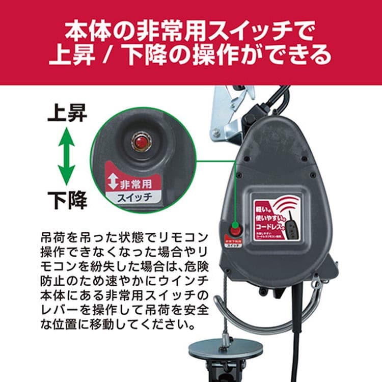 ●操作不能の場合も吊り荷を上昇/加工できる非常用上昇/下降スイッチ付です。