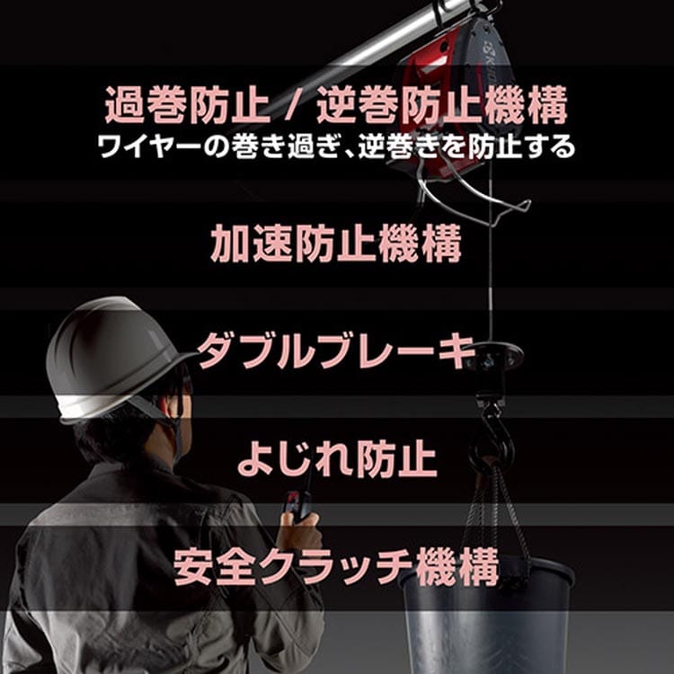 ・取扱説明書をお読みの上、正しくお使いください。・ワイヤーロープが乱巻きの状態でご使用になりますと機械の動作不良・故障だけでなく、ワイヤーロープの早期損傷や切断による事故の原因になります。・必ずアース(接地)してください。・使用電源は銘板に表示してある電圧でご使用ください。・本機の吊り下げは水平でしっかりした場所(吊揚荷重+本体重量に十分耐えられること)に据付してください。・延長コードを使用するときはアース線を備えた3芯コードを使用してください。