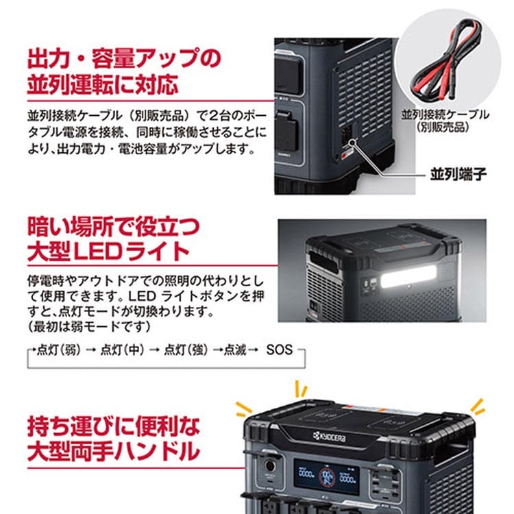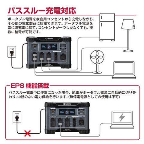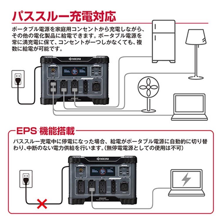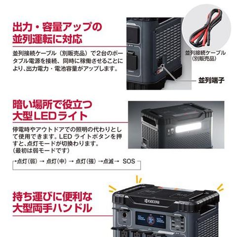 ●従来のポータブル電源(DPS600/1000/1800)では容量の足りない高出力の工具使用時等での電源確保。●リン酸鉄リチウムイオン電池(LiFePO4)の採用により高い安全性の確保、充放電サイクルの向上、充電時間の大幅短縮を実現しています。●パススルー充電とEPS機能付のためポータブル電源を家庭用コンセントから充電しながらその他の電化製品に給電ができます。●パススルー充電中に停電などで入力が遮断されるとAC出力の電力源はバッテリーに切り換わって交流出力の給電が継続が可能、充電中に落雷などで高電流が流れた時に入力を遮断するAC充電プロテクター付きです。●別販売品の並列接続ケーブルを使用すれば2台を接続しての並列運転が可能です。●各コンセントの出力が20A(2000W)を超えた場合に交流プロテクターが作動し交流出力を遮断します。