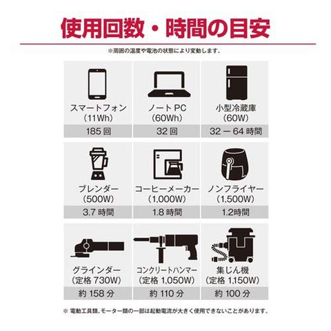 ・取扱説明書をお読みの上、正しくお使いください。・本体を保管する時は低温や高温、高湿度の場所を避けて下さい(5~35度、湿度65%以下がおすすめです)。・使用後は必ず充電して保管して下さい(長期間保管する場合は60~80%の充電をしてから保管されることをおすすめします、電池は自然放電するため3か月に1回、少なくとも6か月に1回は充電して動作確認をして下さい、電池残量が20%以下になると性能が劣化したり充電できなくなるおそれがあります)。・瞬時の電源切替が要求される医療機器やデータサーバー、ワークステーションの電源には絶対に使用しないでください。・ソーラーパネルで充電する場合はポータブル電源本体を日陰などに置いて充電して下さい。・炎天下の車内で使用または放置すると発火、発熱、破裂の原因になります。