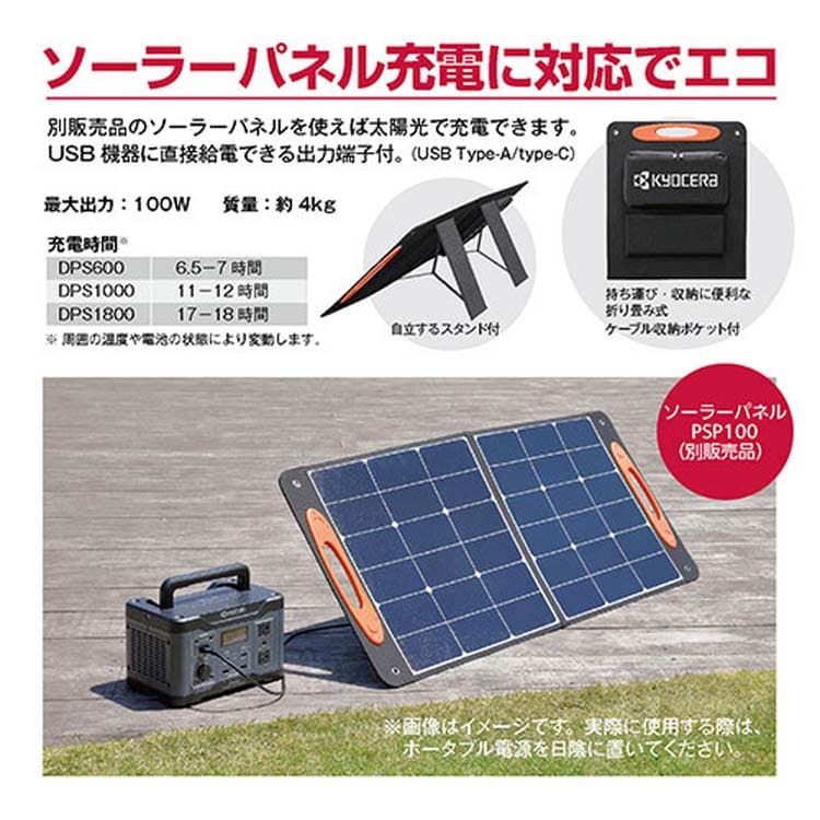 ●ACアダプター、シガーソケット充電ケーブル(12Vシガーソケットからの充電のみ対応)、ソーラーパネル(別販売品/PSP100専用)で充電が出来るので大変便利です。