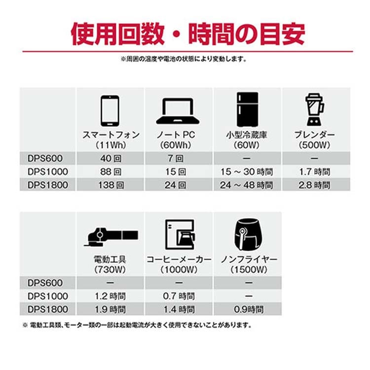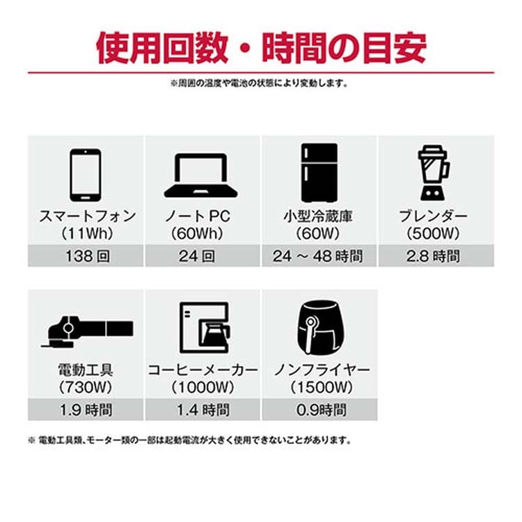 | 使用環境温度(-10~40度C)・充電温度(0~40度C)。電池容量:1601.5Wh。LED照明:5モード(点灯(強)ー点灯(中)ー点灯(弱)ー点滅ーSOS)。出力:定格出力:1000W、AC:2口(各単相・交流100V50/60Hz)。出力:DC(USBtype-A):2口(各5V-2.5A)、DC(USBtype-A急速):2口(各5Vの場合:2.5A、9V/12Vの場合:2A)。出力:DC(USBType-C):2口(各5V/9V/12V/15Vの場合:3A、20Vの場合:3.25A)、DC(シガー/DC5525):シガー(12Vー8A)、DC5525:2口(各12V-5A)、ワイヤレス充電:15W。入力(充電):ACアダプタ:48V-4A-192W、シガーソケット:12V最大100W、太陽光パネル:18V~25V最大20A100W、充電時間(AC):7時間80%_8時間100%、充電時間(DC):16時間80%_17~18時間100%。品名コード:669502A。 |
