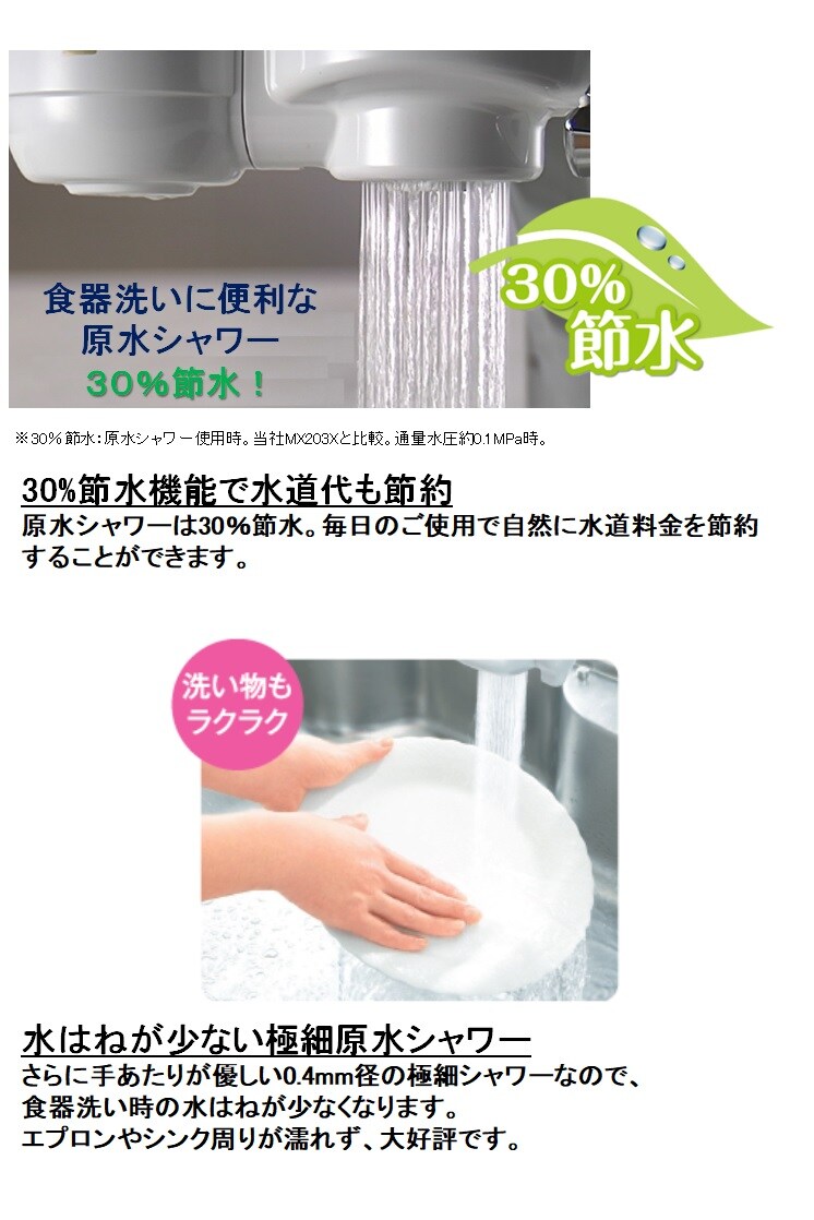 ●水はねの少ない極細シャワー&節水。原水シャワーは極細シャワーで手あたりがやさしく、食器洗い時の水はねが少ないので洗い物もラクラク。さらに30%節水※なので、毎日のご使用で自然に水道代も節約できます。※メーカー品MK203Xと比較。