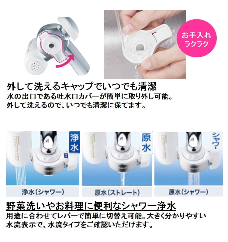 ●蛇口取付型の浄水器カセッティシリーズ。野菜洗いや麺料理に便利なシャワー浄水。