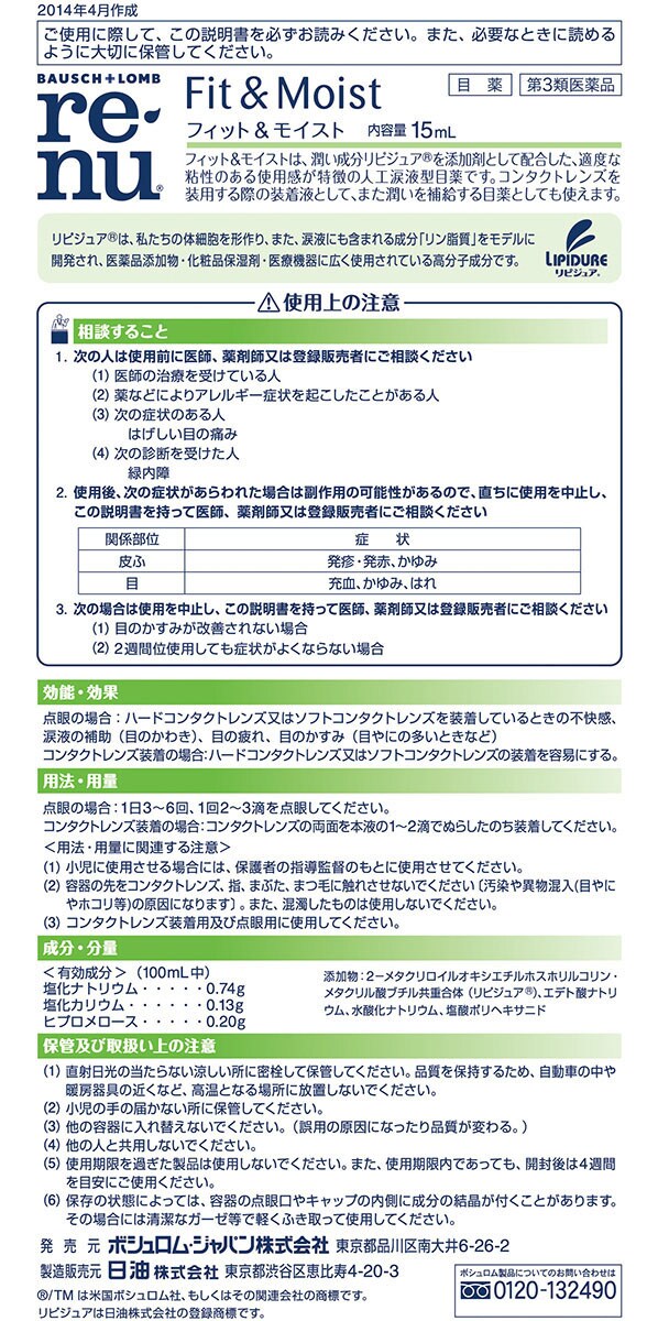 ●フィット&モイストは、潤い成分リピジュア(R)を添加剤として配合した、適度な粘性のある使用感が特徴の人工涙液型目薬です。コンタクトレンズを装用する際の装着液として、また潤いを補給する目薬としても使えます。
