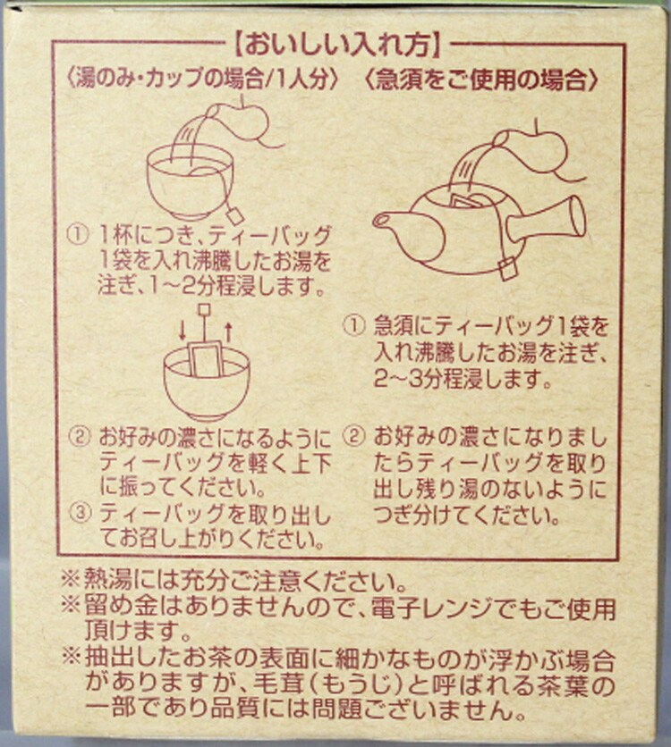 (1)1杯につき、ティーバッグ1袋を入れ沸騰したお湯を注ぎ、1~2分程浸します。