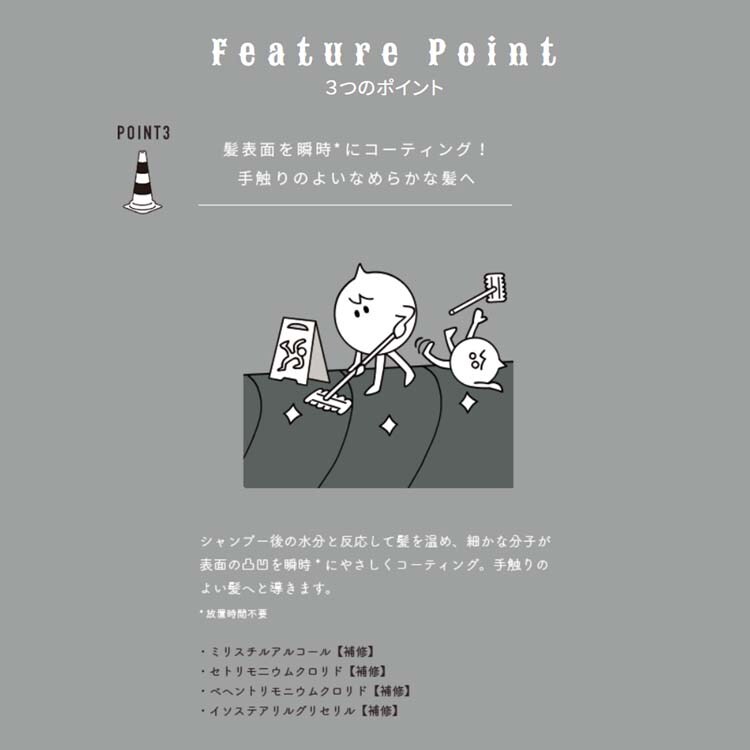 | PG、エタノール、水、ミリスチルアルコール、セトリモニウムクロリド、ベタイン、ヒドロキシエチルウレア、バオバブ種子エキス、ゼイン、シクロヘキサン-1、4-ジカルボン酸ビスエトキシジグリコール、加水分解ケラチン(羽毛)、ベヘントリモニウムクロリド、イソステアリルグリセリル、ジラウロイルグルタミン酸リシンNa、乳酸、イソプロパノール、DPG、香料 |