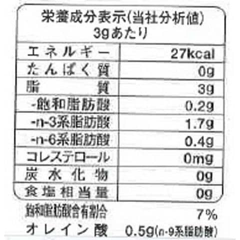 | 3g当たり エネルギー:27kcal、たんぱく質:0g、脂質:3g(飽和脂肪酸:0.2g、n-3系脂肪酸:1.7g、n-6脂肪酸:0.4g)、コレステロール:0mg、炭水化物:0g、食塩相当量:0g、飽和脂肪酸含有割合:7%、オレイン酸:0.5g(n-9系脂肪酸) |