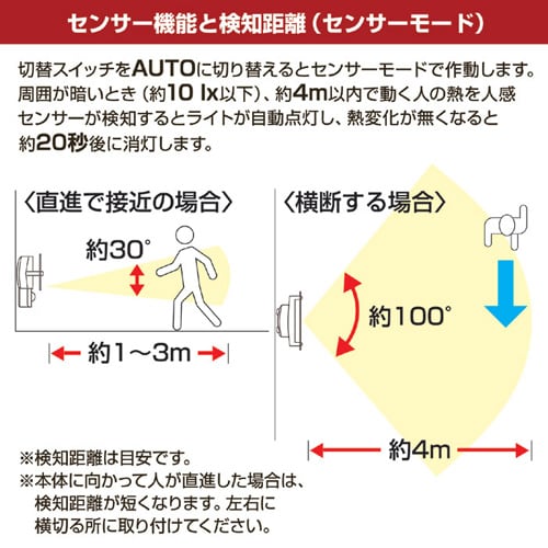 ●周囲が明るい状態では人を感知しないようになっていますので、乾電池式ですが、最長1年間も点灯させることが可能です(1日15回点灯時)。
