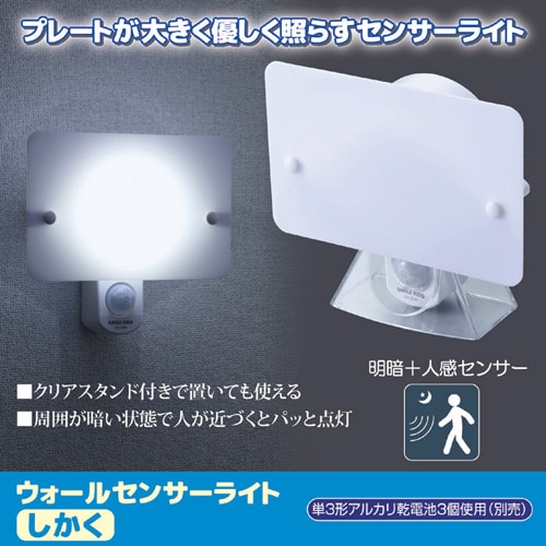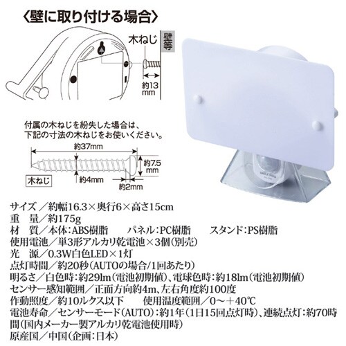 | サイズ:約幅16.3*奥行6*高さ15cm 重量:約175g 明るさ:白色時/約29lm(電池初期値)、電球色時/約18lm(電池初期値) センサー感知範囲:正面方向約4m、左右角度約100度 作動照度:約10ルクス以下 使用温度範囲:0~+40度 点灯時間:約20秒(AUTOの場合/1回あたり) 使用電池:単3形アルカリ乾電池*3個(別売) 光源:0.3W白色LED*1灯 電池寿命:センサーモード(AUTO)/約1年(1日15回点灯時)、連続点灯/約70時間(国内メーカー製アルカリ乾電池使用時) |