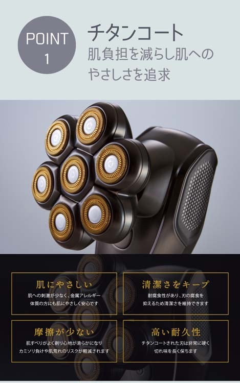 ●肌への刺激が少なく、金属アレルギー体質の方にも肌にやさしいチタンコートの独立可動ヘッド(126枚刃フレキシブル7ヘッド)が頭・口のまわり・腕・足など凹凸のある肌にやさしくフィットし、肌との摩擦を最小限に抑えながらムダ毛をセルフケアできます。