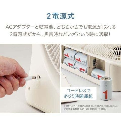 ●乾電池とコンセントのどちらからも電源が取れる2電源式スリムファンがおしゃれなワントーンにリニューアル。