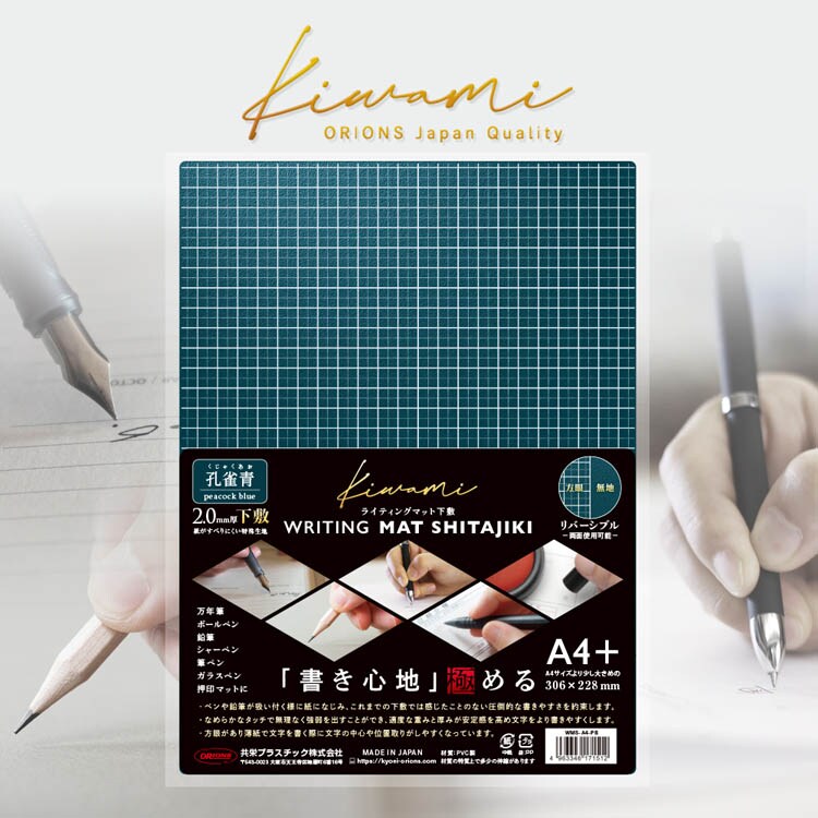 | サイズ:縦306×横228×厚2.0mm 本体:再生PVC製 カラー:孔雀青 peacock blue (深青緑) リバーシブルタイプ:表面/方眼、裏面/無地 日本製 |