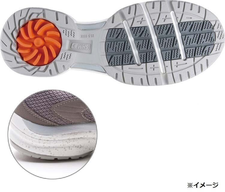 ●靴底のねじれを防ぐ軽量硬質EVAシャンクと、内外に高度差をつけてかかとの着地時の安定性を高めた高弾性EVAを組み合わせたミッドソールにより、快適な歩行をサポートします。