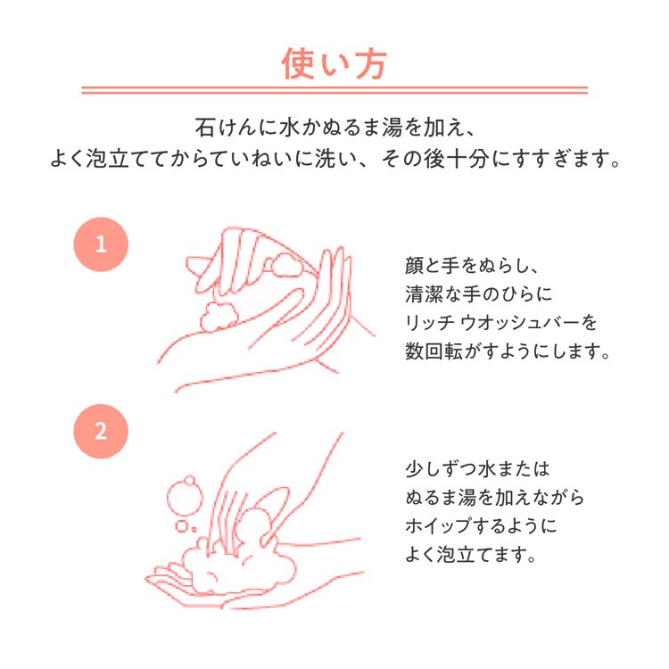 ・石鹸に水かぬるま湯を加え、よく泡立ててからていねいに洗い、その後十分にすすぎます。