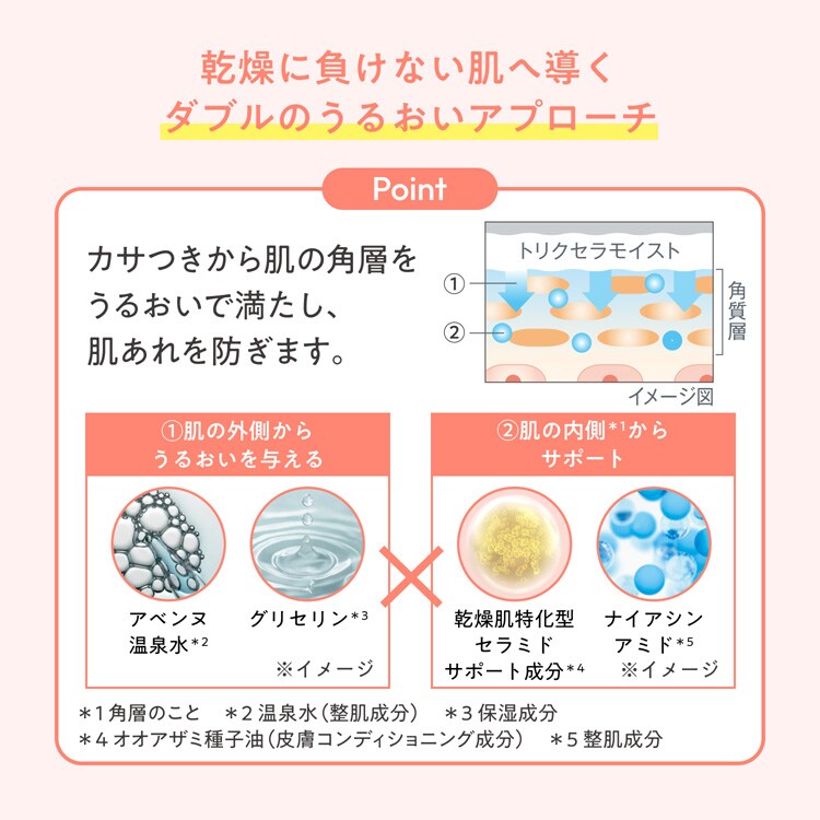 ●アベンヌ温泉水*配合で、うるおいを与え、肌の土台**づくりをサポートしてなめらかに整えます。
