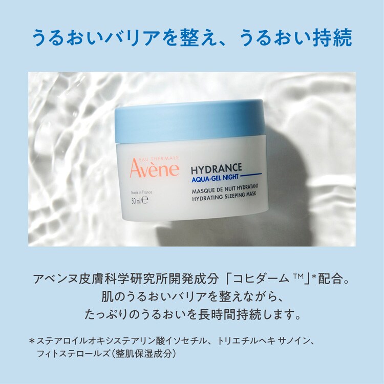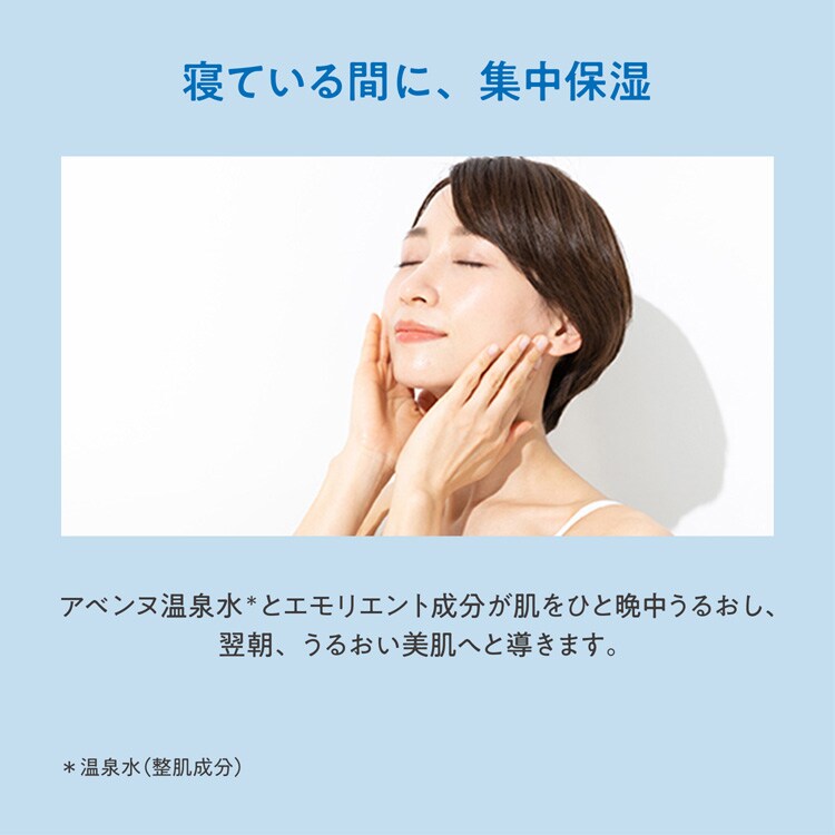 ●アベンヌ温泉水**とエモリエント成分配合で、長時間角層をうるおし、翌朝の素肌をうるおいある肌へ導きます。