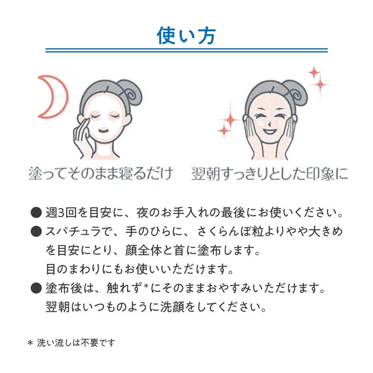 ・塗布後は、触れずにそのままおやすみいただけます。翌朝はいつものように洗顔をしてください。